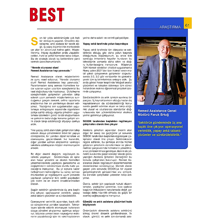 Remed Assistance'deki gelişmeler Best Dergisi Ocak Sayısı insert ekini okumak için tıklayın.